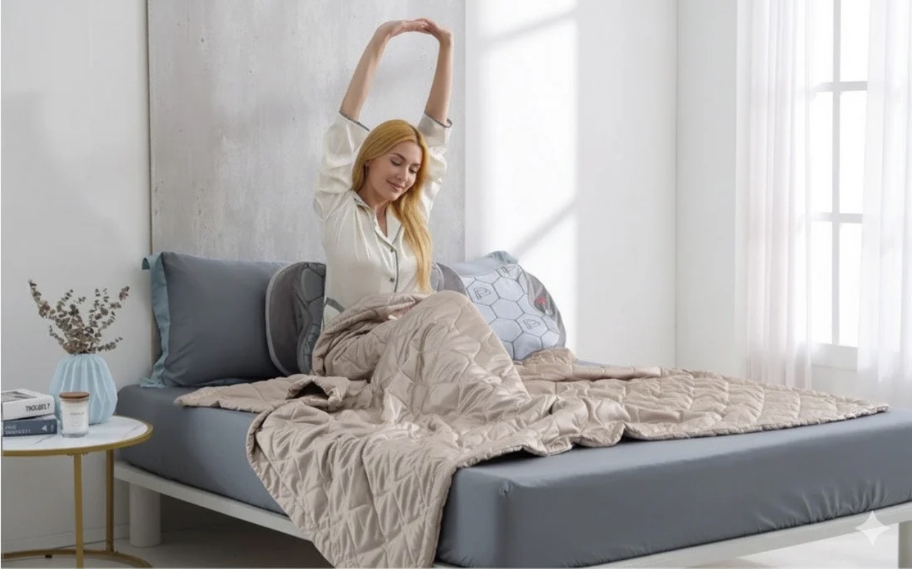 絲棉混紡:這款被子通常採用絲棉混紡的填充物或絲綢布料(產品名稱中也提到了「絲綢」)。絲綢材質輕盈透氣,避免過熱,而石墨烯則能有效鎖住熱量。因此,這款被子既保暖又透氣,能夠有效調節體溫。